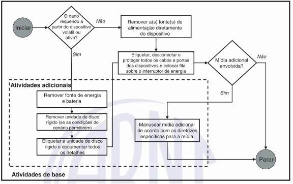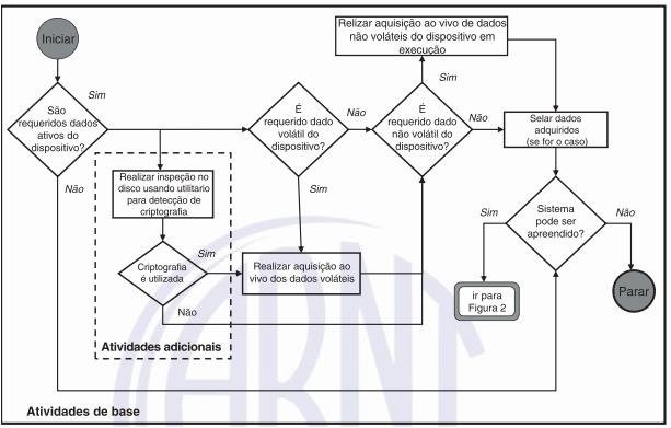 Uma evidência digital é volátil, complexa e pode ser alterada acidental ou voluntariamente após uma coleta. A ABNT (2013) coloca diretrizes para execução de coletas quando se tratar de fazê-los com o dispositivo computacional ligado ou desligado e podem ser caracterizadas como de base e adicionais. Convém que as atividades de base sejam aplicadas em todas as circunstâncias, enquanto as atividades adicionais sejam aplicadas quando forem relevantes e aplicáveis, dependendo do dispositivo único ou das circunstâncias. São mais bem exemplificados nas imagens 8 e 9.