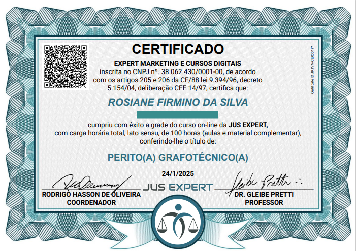 Tenho especialização em Perícia Judicial Grafotécnica e Documentoscopia, e estou me colocando à disposição, para ajudá-los como assistente técnica, na formulação de quesitos, parecer técnico, entre outros trabalhos relacionados.